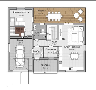 Центр первого этажа — просторная кухня-гостиная площадью почти 40 кв. м. Прямо из неё можно выйти на вместительную прямоугольную террасу. Оборудуйте здесь место для уютных посиделок и отдыха! Также на нижнем этаже расположились санузел и котельная.