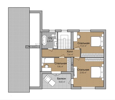 Второй этаж дома образуют три спальни площадью 10 кв. м, 17 кв. м и почти 22 кв. м. Также здесь есть второй санузел. И ещё одна приятная деталь: две из трех спален выходят на балкон.