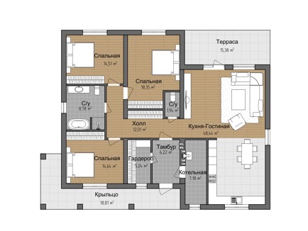 Просторный 1-этажный дом — отличное решение для тех, кто ищет дружелюбное домашнее пространство. Расположение всех комнат в одной плоскости особенно оценят родители маленьких детей или пожилые люди, потому что перемещаться по такому дому не только комфортно, но и безопасно. А размер коттеджа позволит разместиться всем членам семьи с максимальным удобством. Роскошная кухня-гостиная площадью 48 кв. м с выходом на террасу — это настоящее сердце дома.